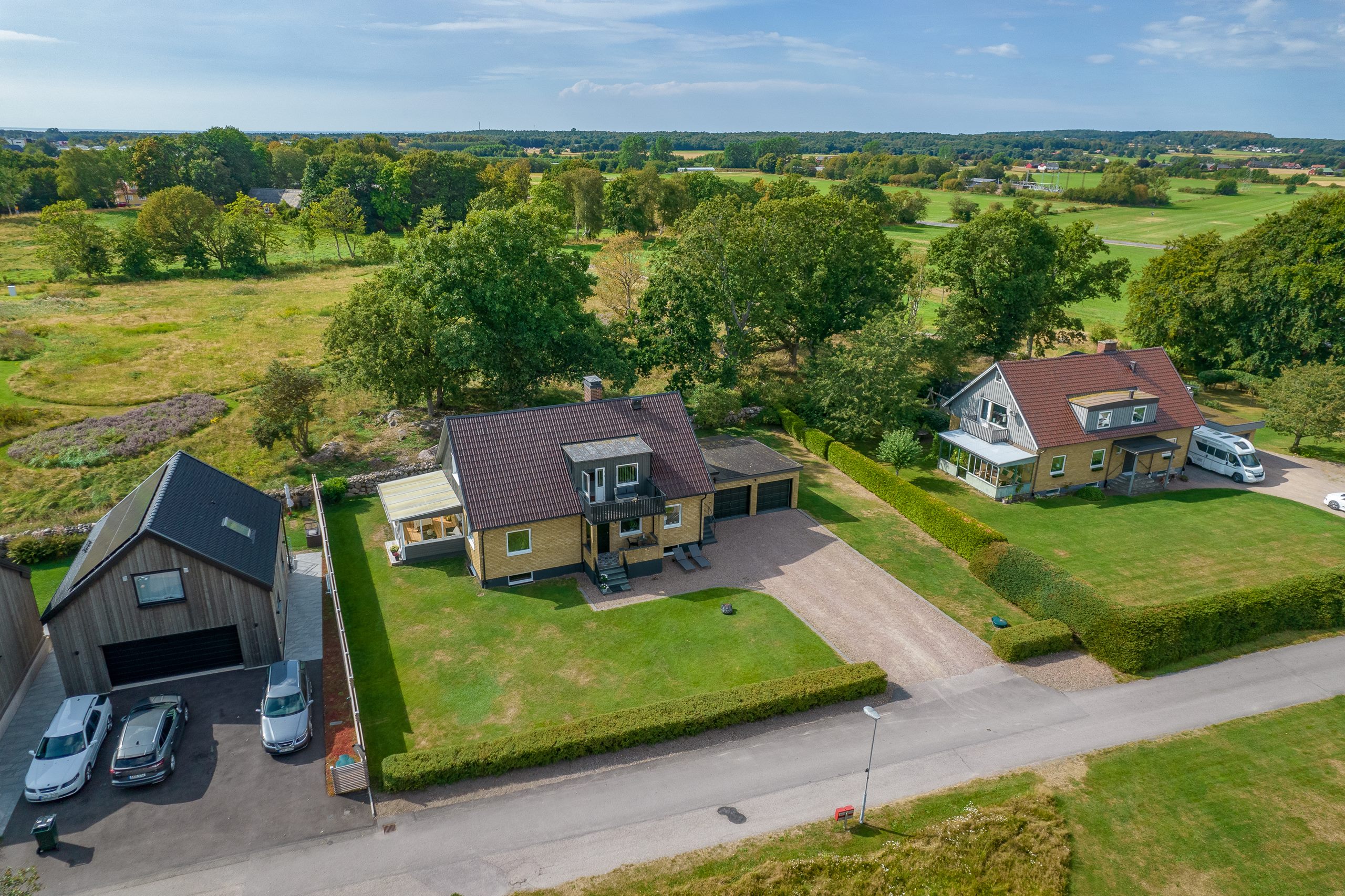 Vidbyggt dubbelgarage med 1 st motordriven port. Öppen bilplats med plats för 2-4 bilar.